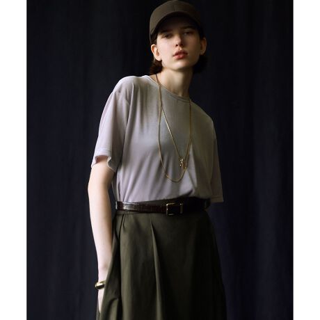 薄手ながらも密度の高いシアーなベロア素材を使用した、エレガントな印象のプルオーバーです。ベロア特有の光沢感を持ちつつも、シアーな質感で重くなりすぎず、軽やかな秋の装いを演出します。ゆとりのあるドロップショルダーのTシャツバランスで、リラックス感がありながらも上品な大人のカジュアルスタイルを叶えます。残暑が厳しい時季にも、一枚で秋のムードを取り入れられるのが嬉しいポイント。デニムでカジュアルダウンしたり、きれいめパンツやスカートと合わせてクラス感を高めたりと、幅広いコーディネートをお楽しみいただけます。カラー展開は、ニュアンス感のあるライトグレー(#033)、カジュアルなスタイルに映えるカーキ(#054)、爽やかなスカイブルー(#072)の3色展開です。