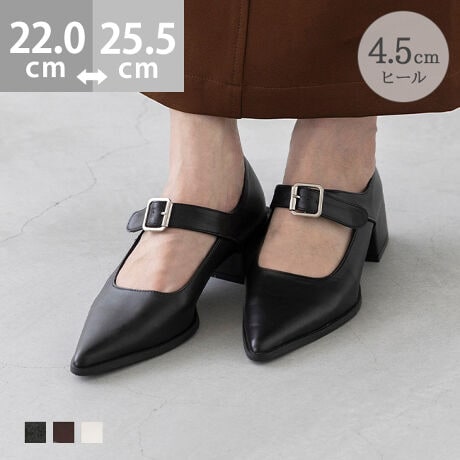 クラシカルな甲ベルトと安定感のあるオーバーヒールが融合し、甘すぎず大人っぽいパンプスに。