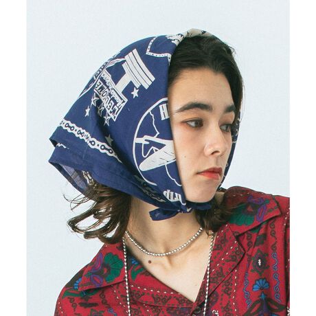 バケーションホテルをテーマにしたグラフィックが、夏の装いにアクセントを添えてくれるバンダナです。
