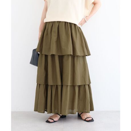 コットン100%のナチュラルな素材感で穿き心地の良いスカート。3段ティアードでふんわりとボリュームを持たせたシルエットがフェミニンさを引き立てます。ウエストは総ゴム仕様で楽に着脱できるのも嬉しいポイント。シンプルなトップスを合わせるだけでサマ見えするおすすめのアイテムです。透け感[ややあり]