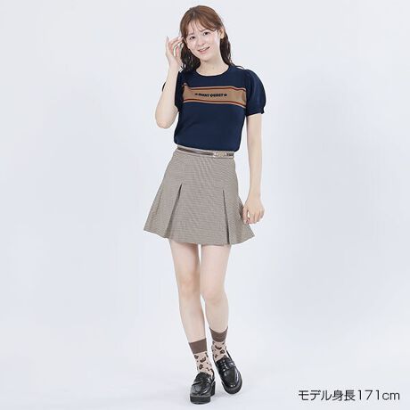 レトロ可愛いニット・プルオーバー。◆ポイント・FRONTにレトロムードなロゴ刺繍・配色ライン使い・半袖パフスリーブ・ドライタッチで着やすい素材感◆コーディネートボトムスから出してもウエストのリブですっきりシルエットに。スカートにもパンツにも好相性です。[型番:225-703805]