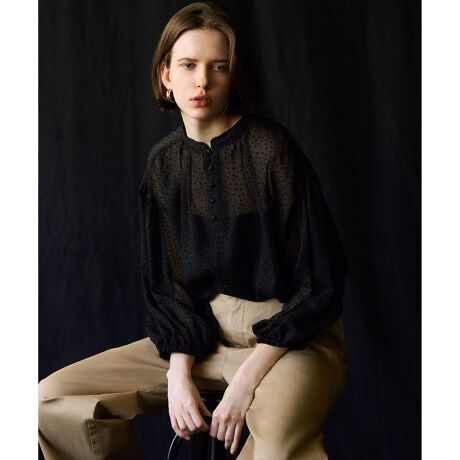 透け感が上品な楊柳素材にドット柄の立体感のあるフロッキープリントを施した素材。楊柳組織の凹凸感がニュアンスのある表情をつくります。残暑ののこる季節に涼し気な印象を与えながらも、秋の雰囲気を感じさせる素材です。