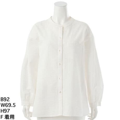 凹凸感が特徴のミラクルウエーブ生地を使用しており、独特の素材感が魅力の一着です。タックとギャザー入りの袖がほどよいボリューム感を演出し、左右のコーディネートによって異なる印象を楽しむことができます。左胸に施された切替ポケットも実用的であり、デザインのアクセントとなっています。