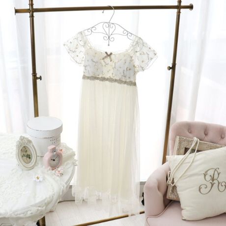 夜空に浮かぶリサマリの星座をイメージした、ルームコレクションです。レースにラメ糸でたくさんの星や月を刺繍することで、全体がキラキラと輝き、ひときわロマンティックなデザインに仕上がりました。リサマリのロゴにはさりげなく星をプラスして、流れ星のような遊び心を演出。カップ下のケミカルナローレースにも星やリサマリロゴをあしらいました。透け感のあるふんわりしたチュールレースを身生地にたっぷりとあしらい、あどけない可愛らしさを後押し。身体のラインを拾いにくい、ゆったりとしたサイズ感も魅力です。ギャザーを寄せたスクエアネックデザインは、アウターライクな印象に。色使いは季節感を取り入れた、上品なヌーディーカラーでまとめました。「ホリー」シリーズを身に着けて、心ときめく夜になりますように。そんな願いを込めてお届けいたします。