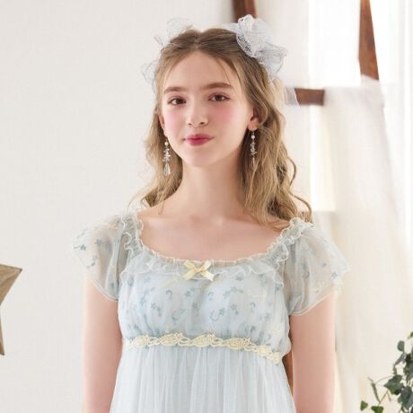 夜空に浮かぶリサマリの星座をイメージした、ルームコレクションです。レースにラメ糸でたくさんの星や月を刺繍することで、全体がキラキラと輝き、ひときわロマンティックなデザインに仕上がりました。リサマリのロゴにはさりげなく星をプラスして、流れ星のような遊び心を演出。カップ下のケミカルナローレースにも星やリサマリロゴをあしらいました。透け感のあるふんわりしたチュールレースを身生地にたっぷりとあしらい、あどけない可愛らしさを後押し。身体のラインを拾いにくい、ゆったりとしたサイズ感も魅力です。ギャザーを寄せたスクエアネックデザインは、アウターライクな印象に。色使いは季節感を取り入れた、上品なヌーディーカラーでまとめました。「ホリー」シリーズを身に着けて、心ときめく夜になりますように。そんな願いを込めてお届けいたします。