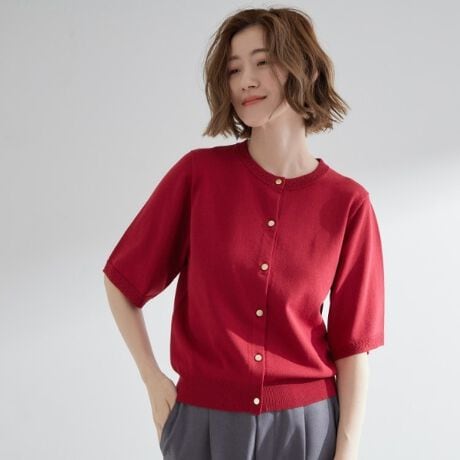 身頃は天竺編み、衿と袖口にはアイレット編みを施したハーフスリーブカーディガン。