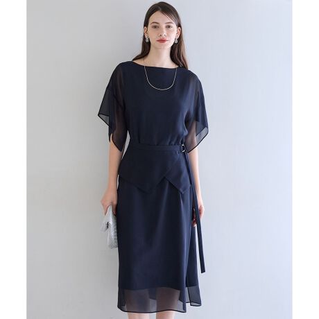シアーな素材を使ったシンプルなドレスと別布ベルトをセットにした着回しを楽しめるデザインドレス。袖はハンカチーフヘムにすることでシンプルながら動きのあるデザイン。さりげなく気になる二の腕もカバーします。 1枚でさらりと着用してもシルエットが美しく、またお好みで着脱可能の別布ベルトでシルエットや雰囲気を変えてもお楽しみいただけます。カラーは、清楚な気品が漂う黒色に近いネイビー(#075)、シックな雰囲気を引き立てるブラック(#005)の2色展開です。