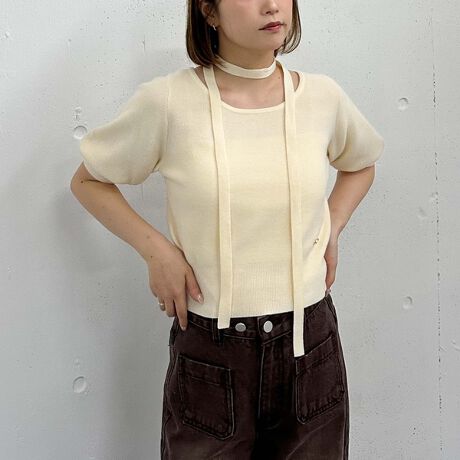 毛足の短いフェザーニットで、秋のはじまりに取り入れやすいアイテムです。