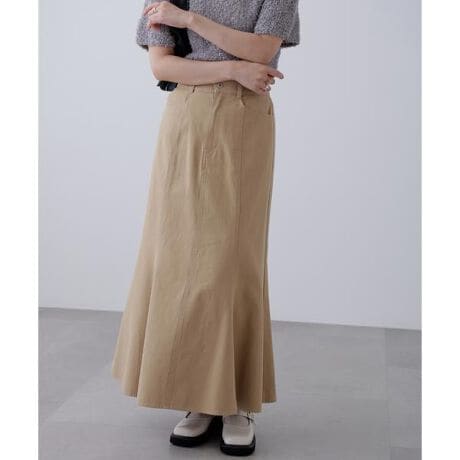 〔fabric&design〕カジュアルなチノ素材で、あえてレディースなマーメイドスカートに落とし込んだ1枚。硬めのチノを水洗いし柔らかい風合いに仕上げることで、シワなどの軽減と着心地の良さが出ています。ヒップまわりはスッキリと、裾でフレア展開を増やしたメリハリのあるボディ感です。ウエスト周りはデニムパンツに用いられるリベットボタンとポケットで、見頃の切り替え箇所はダブルステッチでカジュアルをプラスしています。〔styling〕コンパクトめのデザインニットやタンクトップとのスタイリングがおススメです。
