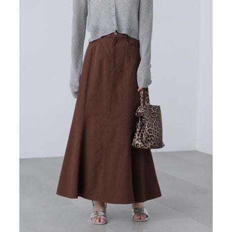 〔fabric&design〕カジュアルなチノ素材で、あえてレディースなマーメイドスカートに落とし込んだ1枚。硬めのチノを水洗いし柔らかい風合いに仕上げることで、シワなどの軽減と着心地の良さが出ています。ヒップまわりはスッキリと、裾でフレア展開を増やしたメリハリのあるボディ感です。ウエスト周りはデニムパンツに用いられるリベットボタンとポケットで、見頃の切り替え箇所はダブルステッチでカジュアルをプラスしています。〔styling〕コンパクトめのデザインニットやタンクトップとのスタイリングがおススメです。