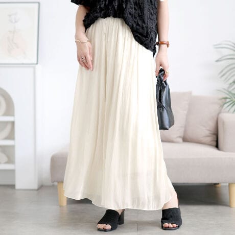 ふわっと広がるエアリーなラインが魅力のシアーワイドパンツです。まるでスカートのような軽やかさを纏えるボトムス。ウエストまわりにギャザーを施し、気になる脚ラインをきれいに隠します。さりげなく縦ラインが入ったシアー素材が、視覚的にも脚長効果を演出。軽やかな透け感が重たく見えがちな下半身を程よく抜け感のある印象に。裏地付きで安心感もあり、カジュアルにもきれいめにもなじむ絶妙なバランス。普段使いはもちろん、お出かけや女子会、リラックスしたオフィススタイルにもぴったりな一枚です。