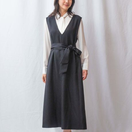 [型番:30-52-08-531]表面に凹凸が浮き出る独特な風合いのラチネで仕立てられたジャンパースカート。シャープな印象を与えてくれるVネックデザイン。ボウタイやフリルをあしらったボリューム感のある華やかなブラウスと合わせたコーディネートもおすすめです。ゆるやかに広がるエレガントなAラインのシルエットもポイント。ウエストマークに映える共布のリボンベルトでフェミニンさも一層高めてくれます。・カラー展開はブラック、ブラウン・サイズ展開は1(M)9号・3(2L)13号