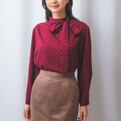 [型番:30-52-01-515]幾何柄のカットジャガードで仕立てられた長袖プルオーバー。華やかなアクセントをプラスするリボン付きデザイン。シンプルなスタンドネックとしても着用が可能です。ふわふわとした表面感のあるカットジャカードが立体的な表情をプラス。袖口のボタンの着脱でシルエットの変化も楽しむことができ、着こなしの幅も広がるアイテムです。・多少透け感あり・ストレッチなし・カラー展開はブラウン、ボルドー・サイズ展開は1(M)9号・3(2L)13号