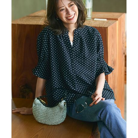 袖と襟元のタックがポイントのデザインシャツです。素材の凹凸感もあいまって、盛夏にぴったりの肌離れの良い涼しげなシルエットになっています。ピンタックで袖にインパクトを持たせつつ、身頃はすっきりとさせることでバランスよく着ていただける1枚です。シワになりづらいのも嬉しいポイント。カラーは、シックに着こなせるブラック×ベージュドット(#105)、上品な印象のネイビー×ホワイトドット(#175)、柔らかい雰囲気のベージュ×ブラックドット(#133)の3色展開です。