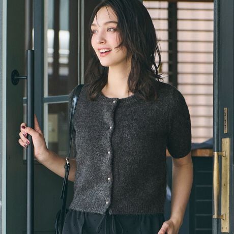 上品なゴールドボタンが目を惹く、半袖ニットカーディガン