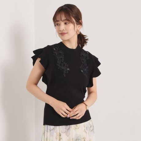 コーディネートがぐっと華やかになるレースモチーフのフリル袖ニット。