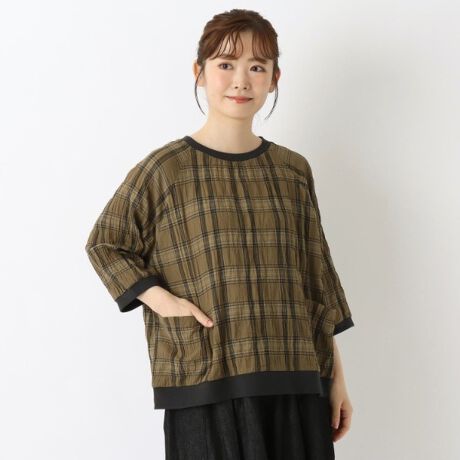 チェック柄 リブ付きラグラン7分袖ブラウス