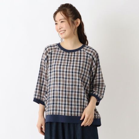 チェック柄 リブ付きラグラン7分袖ブラウス