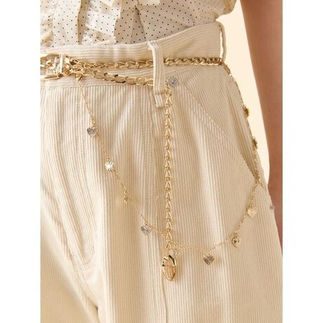 ヴィンテージライクなハートや星のモチーフをあしらった遊び心のあるチェーンベルト。バックル部分は高級感があり、コーデに品を添えます。モチーフ付きチェーンは取り外し可能で位置調整も自由自在。ベルト、ネックレス、バッグチャームとしても使える3WAY仕様で、気分やコーディネートに合わせたアレンジを楽しめます。シルバーは星、ゴールドはハートと、カラーごとに異なる魅力もポイントです。