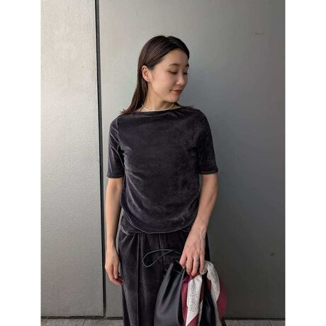 柔らかな風合いでさりげなく透け感を楽しめるフロッキーベロア素材を、ヌケ感のあるボートネックに仕立てたTシャツです。