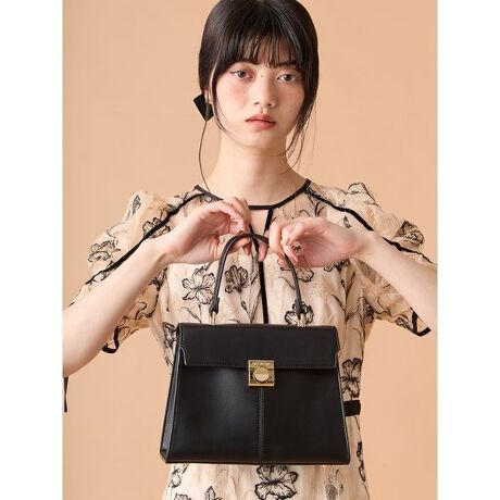 フロントに配したロゴ入りのバックルが、クラシックな中にも高級感を漂わせるワンハンドルバッグ。フェイクレザーは品のあるシボ感が特徴で、ブラックのみ縦に流れるような独特の表情を持たせています。内部には大きめのポケットを2つ備え、見た目以上の収納力を実現。接続パーツにはチャームやキーホルダーが付けやすい仕様を採用し、自分らしいアレンジも楽しめます。ショルダーストラップは取り外し可能で、シーンに応じて使い分けられる2WAYデザインです。
