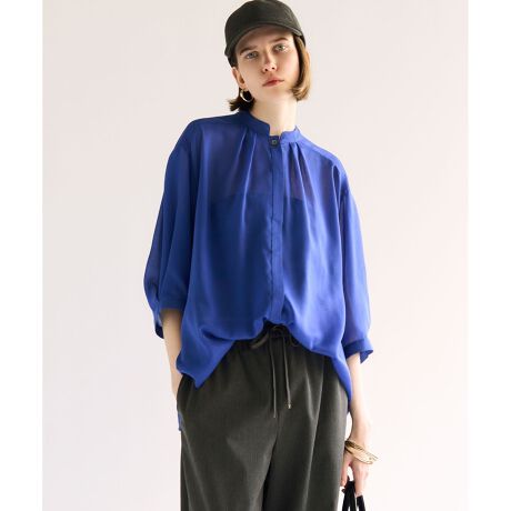 フロントと袖にタックを効かせた、表情豊かなデザインブラウスです。袖に立体感を持たせつつも、シアー感のある素材が軽やかな印象を演出します。スカートにもパンツにも合わせやすい丈感で、様々なボトムスと好相性。オフィスシーンではきれいめパンツと合わせて知的な印象に、デニムと合わせてカジュアルダウンすればデイリーにも活躍します。同シリーズのスカートと組み合わせたスタイリングもおすすめ。一枚で着るだけでサマになり、コーディネートに華やかさをプラスしてくれるアイテムです。カラーは、印象引き締まるブラック(#005)、カジュアルスタイルに映えるダークブラウン(#035)、目を引く深みのあるブルー(#070)の3色展開です。