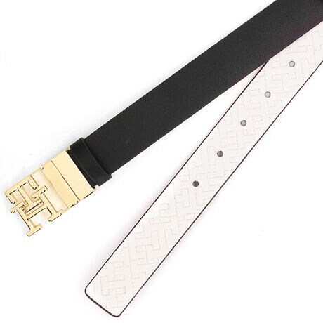片面をフラットに仕上げ、もう一方にオールオーバーモノグラムの型押しを施したリバーシブルベルト。装いやその日の気分に合わせて2通りの使い方ができる便利なアイテムです。THロゴのメタルバックルがスタイリッシュなアクセントに。素材は手触りがよく厚みのあるバッファローレザーを使用しています。・リバーシブル:〇