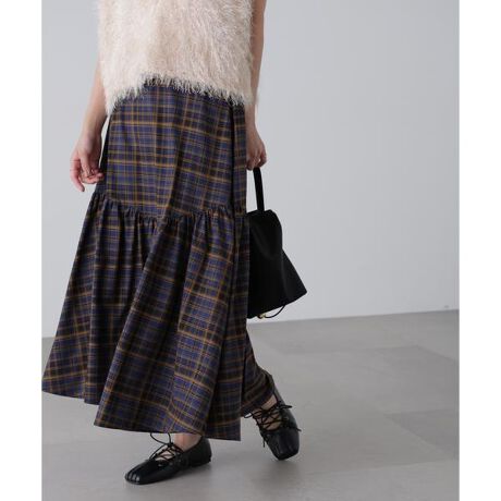 大きめチェック柄にギャザーをふんだんに寄せた存在感のあるティアードスカート。後ろウエストはゴム仕様でストレスフリーなはき心地です。イレヘムの切り替えとスリット、裾も段差をつけることで、歩くたびに揺れる裾がドラマティックなデザイン。主役級のスカートなので、トップスはシンプルなアイテムを合わせるのがおすすめです。トレンドのレイヤードデザインカットソー合わせで上級者な着こなしも今年らしく決まります。※モデルの着用画像の場合、光の当たり具合により、実際の色味と異なって見えることがございます。色味は、商品単体の画像をご参照ください。