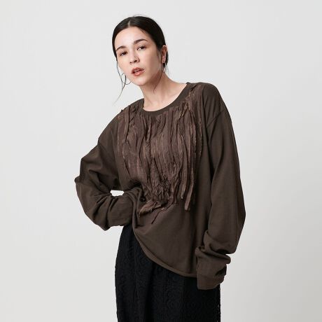 シンプルなTシャツに同系色の別布でフロントを装飾した、クラフト感あふれるロングスリーブカットソー。