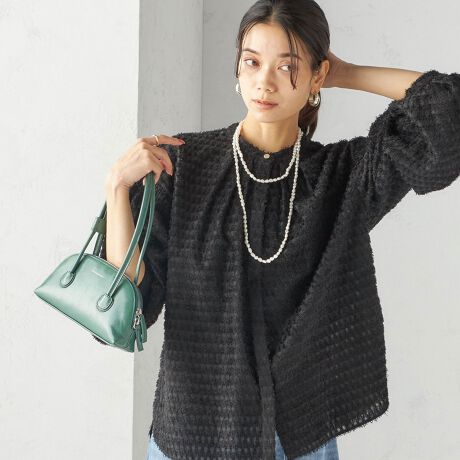 千鳥柄のカットジャカードが素敵なバンドカラーブラウスです。
