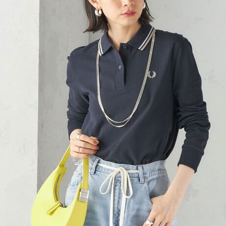 衿と袖にティップラインが入ったFRED PERRYのウィメンズの長袖ポロシャツ。