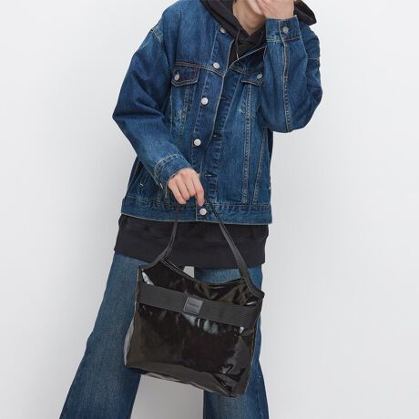 綿生地にPVCの表面加工を施した生地を使用しており、ソフトなエナメルのような質感と、深みのある色合いが新鮮な印象のバッグになりました。