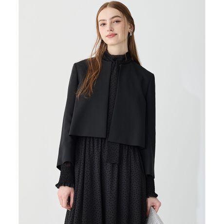 センターバックにタックを入れ、ややボリュームをもたせたノーカラージャケット。ドレスと合わせてバランスのよい、広がりすぎない分量感とレングスにこだわり、体のラインを程よくカバーしながら、きちんと見えするすっきりとしたデザインです。袖口にさりげなくスリットを入れることで、袖デザインのあるドレスとも相性がよく、着心地よく仕立てています。華やかなシーンにはもちろん、お仕事、学校行事などにも着回しの効くデザインです。シックな魅力を引き立てるブラック系(#005)と清楚な雰囲気の濃いめのネイビー系(#075)の2色展開です。