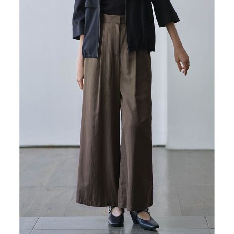 ■デザイン裾に向かって分量感のあるスカート見えのワイドパンツです。前ベルト部分はスッキリさせ、後ろベルト部分にゴムギャザーを効かせている為、履き心地の良いデザインに仕上げています。トップスを選ばず、スタイリングに抜け感と軽さをプラスしてくれるアイテムに仕上げています。単品使いはもちろん同素材のジャケットとセットアップでの着用もおすすめです。