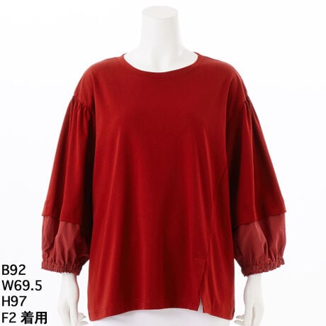 この袖切替カットブラウスは、異素材の袖切り替えが特徴的で、同系色で統一感を持たせています。