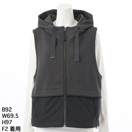 異なる素材を組み合わせて同系色でデザインしたベスト。