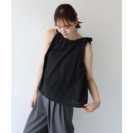 印象的な肩リボンと、凹凸感のあるドット生地が可愛いノースリーブブラウス。