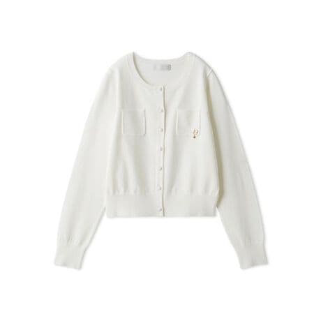 胸元で光るオリジナルロゴパーツと揺れるビジューチャームがキャッチーなカーディガン。