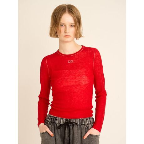 柔らかで上質なウールを使用し、繊細な透け感が女性らしさを引き立てるリブプルオーバー。今年らしいクルーネックデザインで、さまざまなアイテムと相性の良いコンパクトなシルエットが魅力です。フロントにはジャガードでロゴをあしらい、さらに各パーツを接ぐリンキング部分に配色の糸を使用し、さりげないデザインポイントをプラスしました。透け感;ややあり