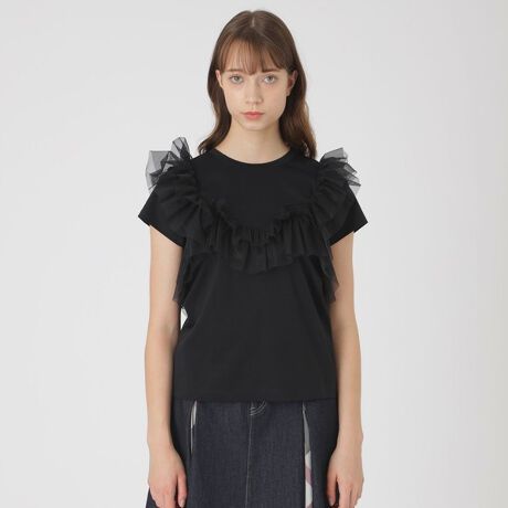 ベースがシンプルな半袖Tシャツなので甘すぎず、デニムなどパンツスタイルにもスカートにも合わせやすいデザインです。