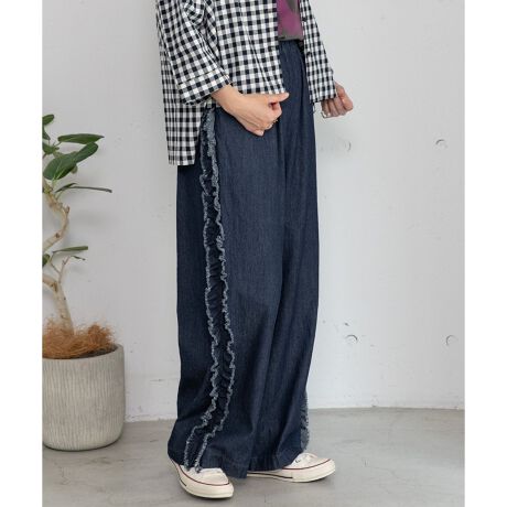 サイドのフリルディティールで大人ガーリーを、さりげなく。ストンと落ちるストレートシルエットがきれいなフルレングスパンツで、甘すぎない可愛さを添えてくれます。綿100%の素材感と、ウエストゴムでストレスフリーな履き心地。内紐でフィット感を調節いただけます。Tシャツ合わせでラフに着ても、ちょっとしたお出かけ仕様に◎両サイドポケット付き。