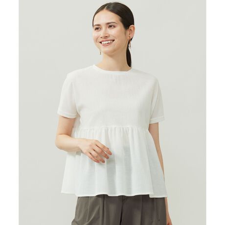 表情感のある素材を使用したペプラムシルエットのカットソー■デザインふんわりと膨らむペプラムシルエットのカットソーです。パッとかぶるだけでブラウスのような華やかできちんとした印象になります。ジャージならではの着心地やお手入れのしやすさをキープしながら、1枚でスタイリングが決まるデザインです。裾が程よく広がっているので、ワイドパンツやテーパードパンツ、タイトスカートなど、様々なものと合わせて着て頂けます。■素材特殊な編み機を使用し、織物のように経糸に緯糸を絡ませて編んでいくため、織物より密度が詰まっておらず軽量なことが特長です。ポリエステルと綿を交編し、さらにリネンをいれることで独特の組織感のある素材になっています。■同素材アイテムブロッキングカットソー(KKWMGA0232)