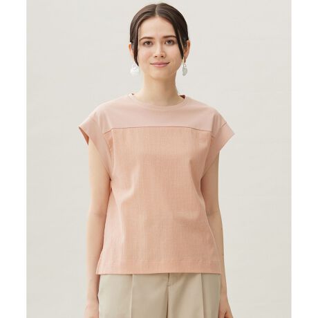 1枚でもシャツやジャケットを羽織っても着て頂ける異素材ブロッキングカットソー■デザイン胸位置で切り替えた異素材ブロッキングがビスチェをレイヤードしているように見えるデザインカットソーです。すっきりとしており、ジャケットやシャツを羽織っても着て頂きやすいシルエットになっています。長過ぎない程よい丈感なので、インでもアウトでも着て頂けます。■素材特殊な編み機を使用し、織物のように経糸に緯糸を絡ませて編んでいくため、織物より密度が詰まっておらず軽量なことが特長です。ポリエステルと綿を交編し、さらにリネンをいれることで独特の組織感のある素材になっています。■同素材アイテムペプラムカットソー(KKWMGA0231)