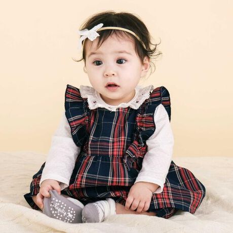 シーズンムード高まるチェック素材を使用した女の子用セットアップ。