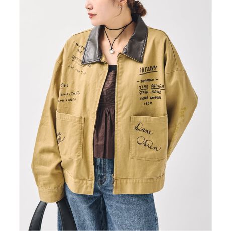 手書き風のグラフィックや襟のみレザー調の素材に変更するなど、1枚でスタイリングの主役になるアイテムです。