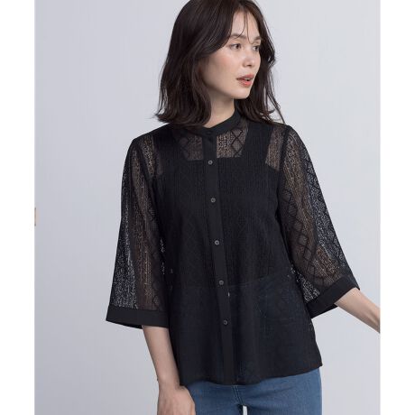 ■デザイン・1枚で着ても羽織り物として着ても着映えするトレンド感あるブラウスです。・襟ぐり、前立て、袖口に別布を使用しポイントになっています。・身頃はダーツのないサラッと着れる分量感。袖は少し短めにして抜け感を出しています。