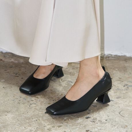 踵シャーリングゴム仕様のスクエアトウセンターシームパンプスが「ファビオルスコーニ」から登場しました。