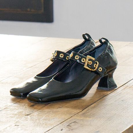 存在感のある甲ベルトとくびれたヒールのフォルムが特徴的なスクエアトウパンプスはモードエレガントな一足です。
