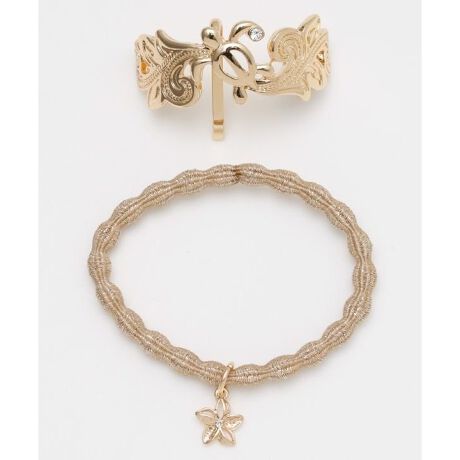 [型番:46PZ5305-2025]ホヌがハワイアンジュエリー調の刻印と共にデザインされたヘアカフとヘアゴムのセット。髪を結んだ後に差し込むだけでヘアアレンジができます。きらりと輝くラインストーンがポイント。