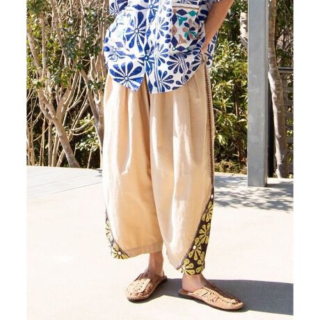 [型番:IAC-5237-2025]クジャラート州に住まう「カッチ族」から着想を得たワイドシルエットのワークパンツ。カッチ族ならではのハンドワークであるミラーワーク刺しゅうを大胆に取り入れ、涼し気な素材感のインド綿スラブで仕上げた。トップスを引き立たせる存在感のあるアイテム。